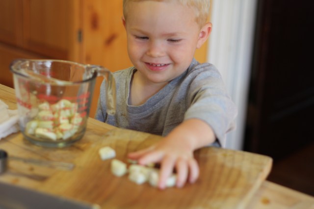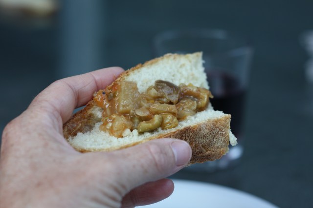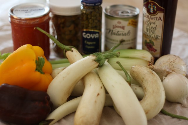 My sous chef and I spent around an hour chopping, sautéing, and simmering, and the resulting caponata was delicious, but perhaps not so lovely to look at. I think the combination of white eggplant, yellow pepper, and golden raisins along with the other ingredients created a monochromatic color palette. I think next time I make this I’ll try for veggies with more vibrant colors. I will be sure to post an update if I come up with the perfect combination of caponata taste and beauty.