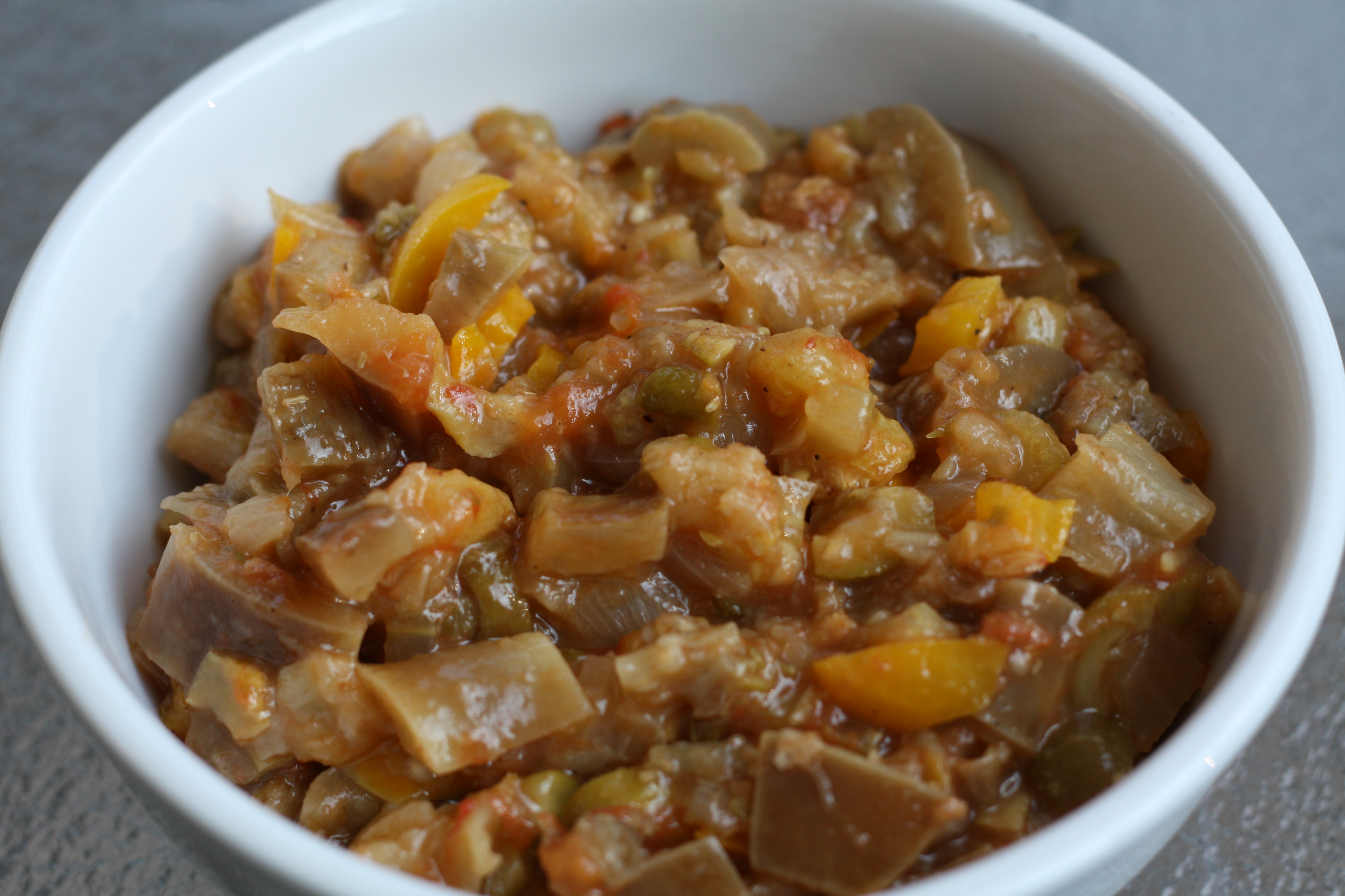 I had on hand white eggplant, onions, and home canned tomatoes from this summer’s garden. From last week’s farm share from Laughing Stock Farm, I had some sweet bell peppers. All that plus a few pantry and grocery items and I was ready to create kitchen magic (hopefully).