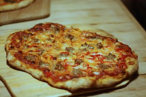 This week had a roasted carrot and onion pizza with Swiss cheese. Last week roasted tomato & basil with mozzarella, and homemade sausage with pepper and onion.