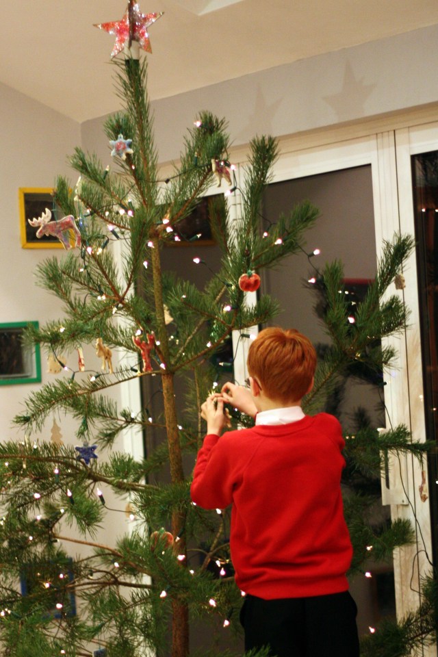 In Maine, typically we go to a local Christmas tree farm to cut down a lovely and fragrant balsam fir tree. This year, we went in the opposite direction. One Saturday, we went for a scenic drive and saw “Festive Trees” laying by the side of the road available for your decorating pleasure if you left a donation to the National Trust of England. They were perfectly brilliant and scraggly “Charlie Brown Christmas” trees. Much to Joey’s dismay, we selected the best of the bunch and brought one home.
