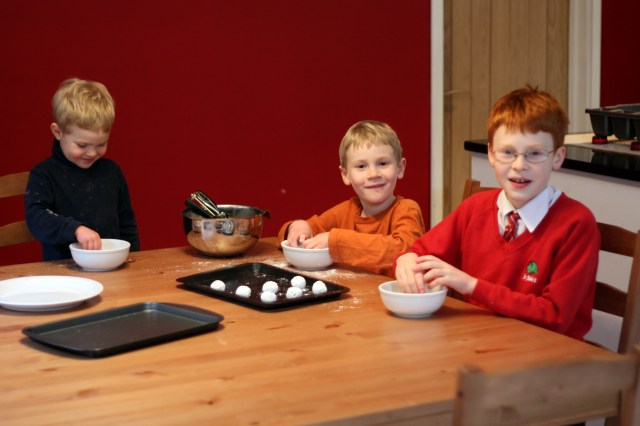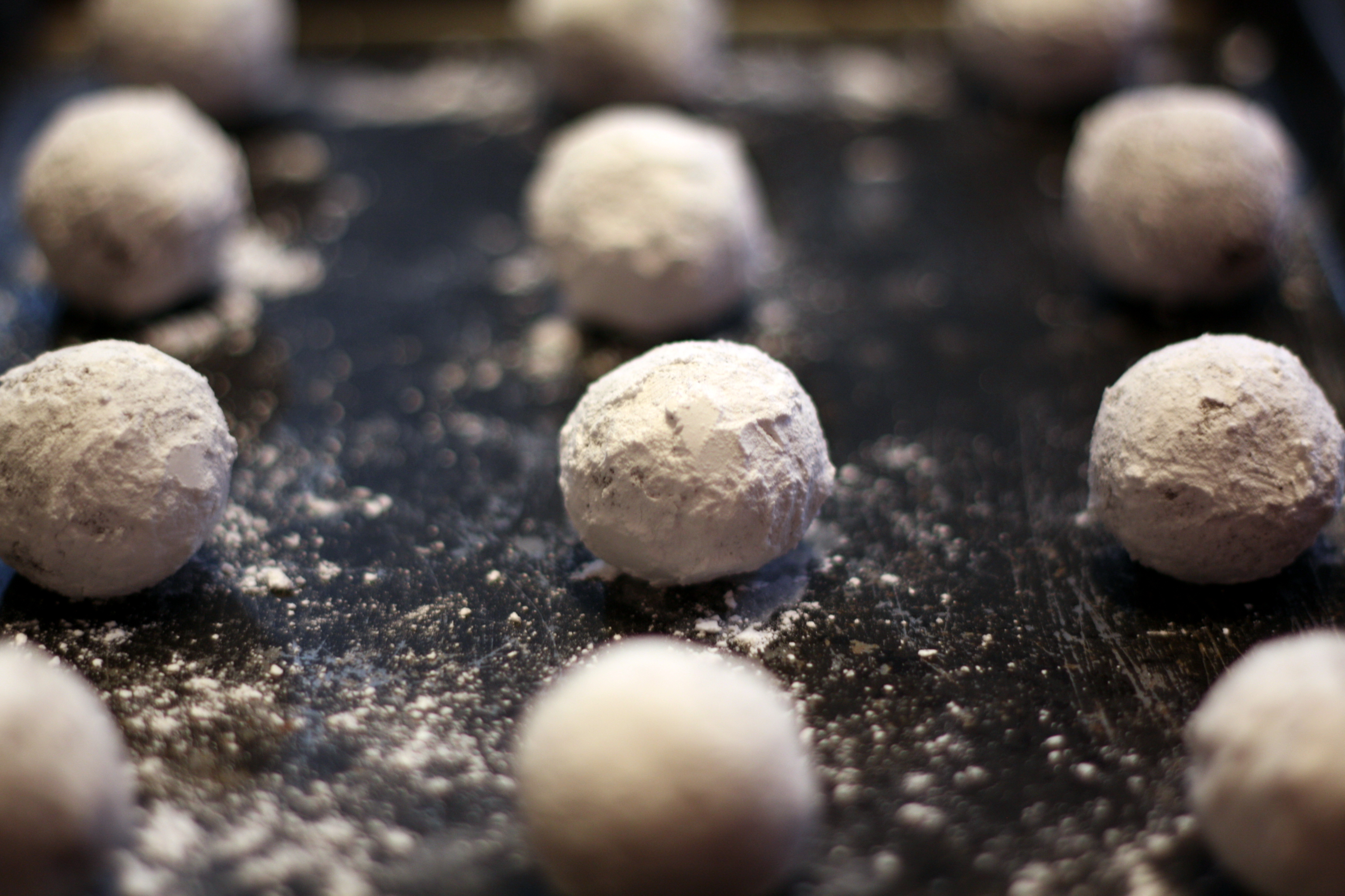 This is a nice cookie to make with children because the rolling and sugaring process is really fun! When we first made these cookies (trial #1 of the recipe), we didn’t have any powdered sugar so we rolled them in granulated sugar prior to baking. This time I had planned on just using powdered sugar, but Joey suggested we do both types of sugar because the granulated sugar gave a nice crunch to the outside. So, we double-rolled these guys! Joey has excellent chef sense sometimes.