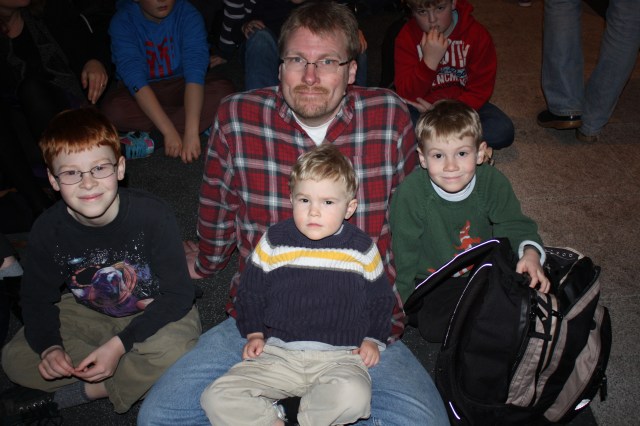 The guys are waiting for the show "Flash Bang Wallop!" to begin. This was an excellent presentation about combustion and explosions.