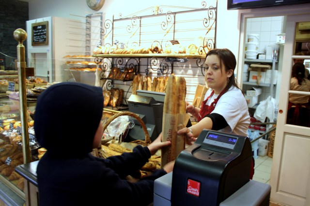 On our way back to our apartment, we stopped for some baguettes.  Joey enjoyed practicing a little French to make the purchase!